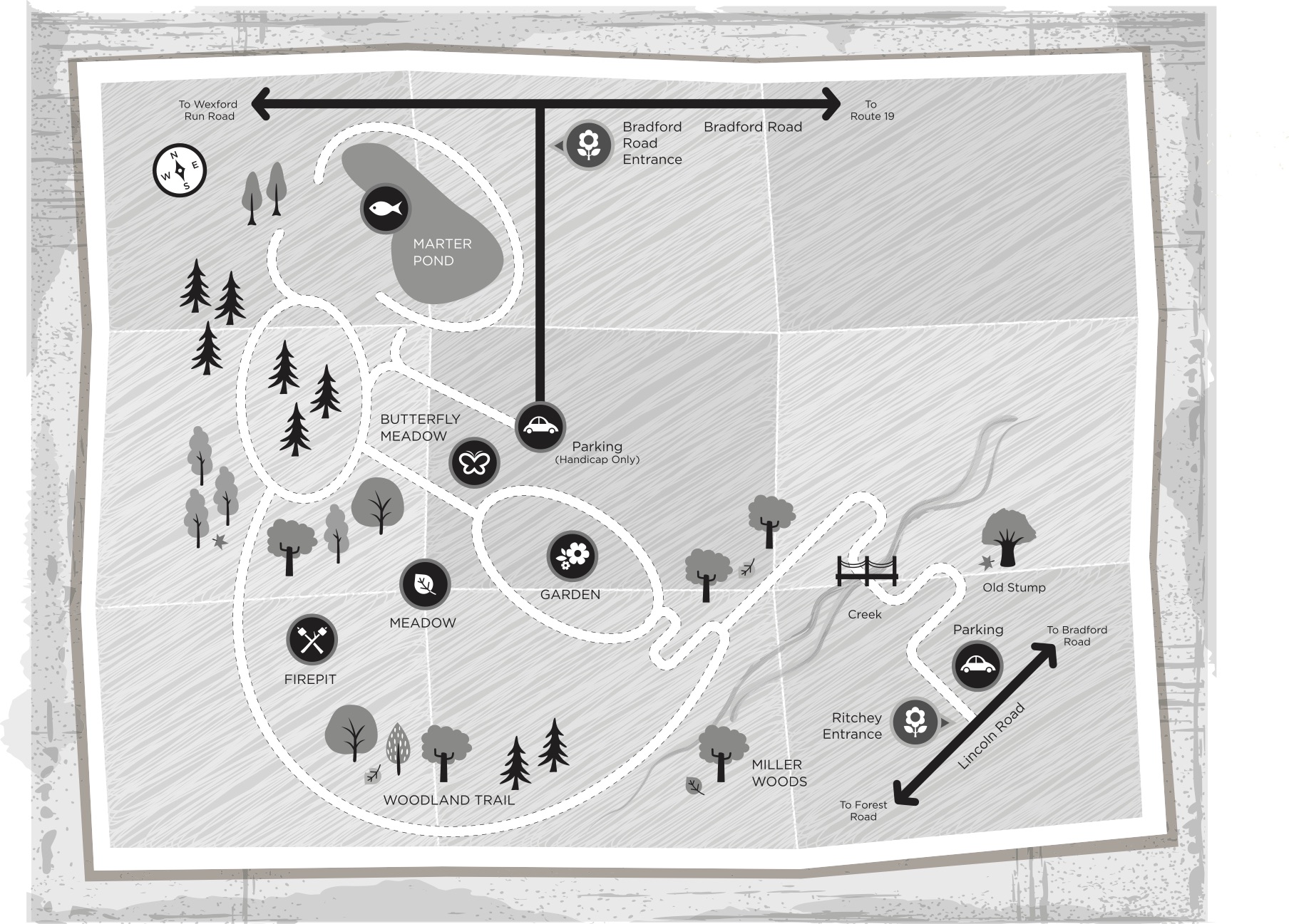 Bradford Woods Reserve Detailed Map. Providing an easy to follow map and description of the Reserve and it’s diverse areas, including Marter Pond, the fire pit, Butterfly Meadow, Miller Woods and the creek.